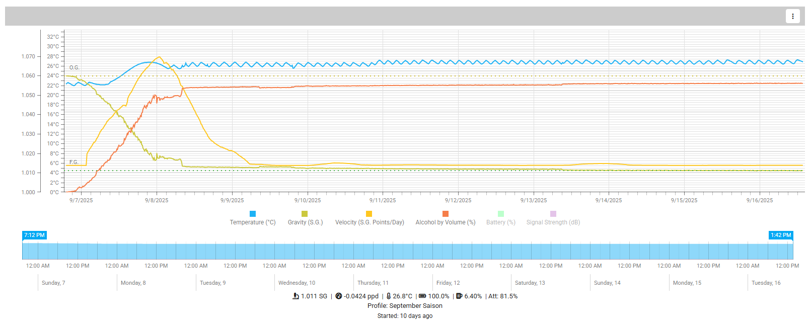 Pressure was kept low/off for the first 6 days and then the spunding valve closed to allow some CO2 capture, but hopefully not interfere with cleanup.